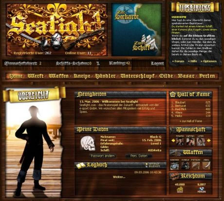 Erkämpfe Dir Ruhm und Ehre und den Respekt der feindlichen Piraten beim Browser Spiel Seafight! Werde in Echtzeit zum erfolgreichsten Piratenkapitän aller Weltmeere und kämpfe aufregende Seeschlachten in bestechender 3D-Optik gegen andere „menschliche“ Online-Piraten. Erlege angsteinflößende Seeungeheuer und vernichte feindliche Piraten. Dir stehen die verschiedensten Charaktere zur Auswahl, die schrecklichsten Schurken befinden sich darunter. Stelle Dir eine mit allen Wassern gewaschene Crew zusammen und mache Dich auf zu packenden Piraten-Abenteuern. Zu Beginn segelst Du mit Hilfe einer 3D-Karte mit einem Standardschiff durch die Meere und erkämpfst Dir Gold für Deine Beutetruhe. Mit Deinem Gold kannst Du Dein Schiff mit Kanonen, Segeln, Beibooten und anderem Equipment für Deine Crew aufrüsten. Entere Deine Piraten-Gegner und bringe sie zur Strecke. Ein ausgefeiltes Schadensmodell, Tag- und Nachtmodi und eine geniale 3D-Grafik lassen echtes Piraten-Flair aufkommen. Kommunizieren kannst Du mit anderen Online-Spielern per Chat. Erlebe ein kreatives und aufregendes Piraten-Spektakel mit Seafight und mache Dich auf zum berühmtesten Piraten!